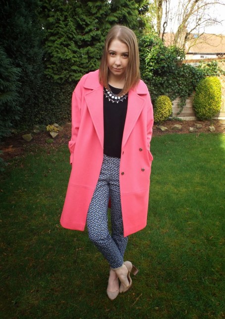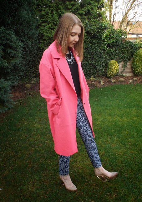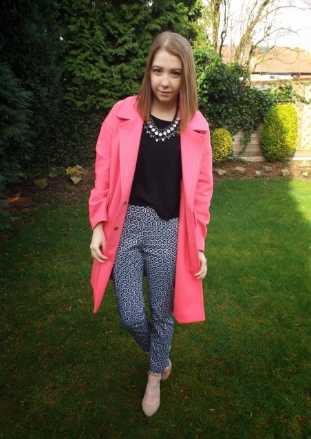 I love to clash colours when dressing and today it was the turn of cobalt blue and bright pink. Last year I practically lived in these cropped retro print trousers and I can’t wait to start wearing them again this spring. With such bold pink and blue tones, I thought a nude heel was the best way to finish the look. I wore these Asos heels to my 21st birthday and graduation last year and oh me oh my are they painful! It’s safe to say my feet were in tatters afterwards but “no pain, no gain” I suppose and the perspex heel is definitely a gain! Also, I’m very aware that I am constantly wearing this Zara necklace but it just seems to go with everything….bit clingy.