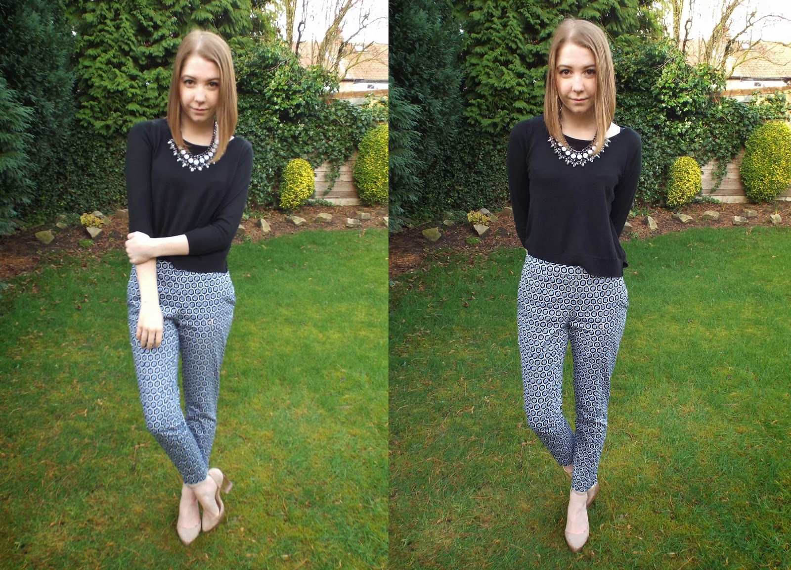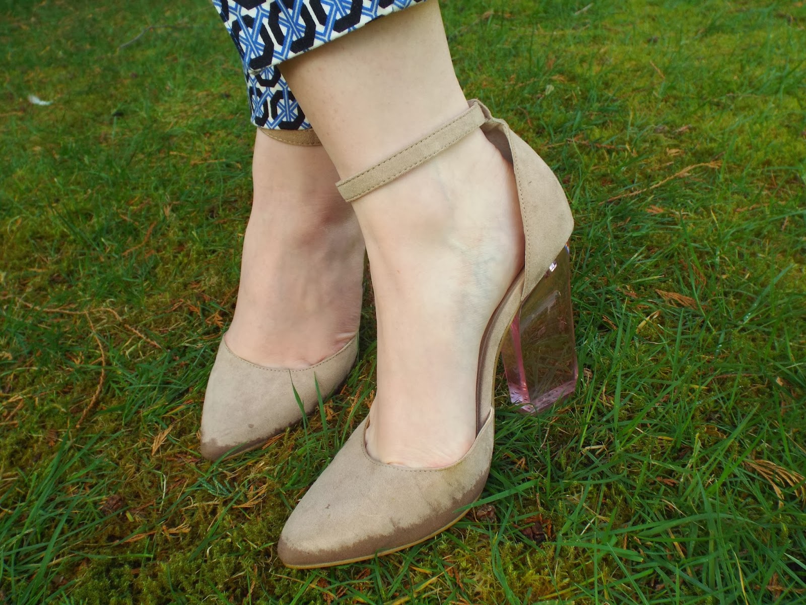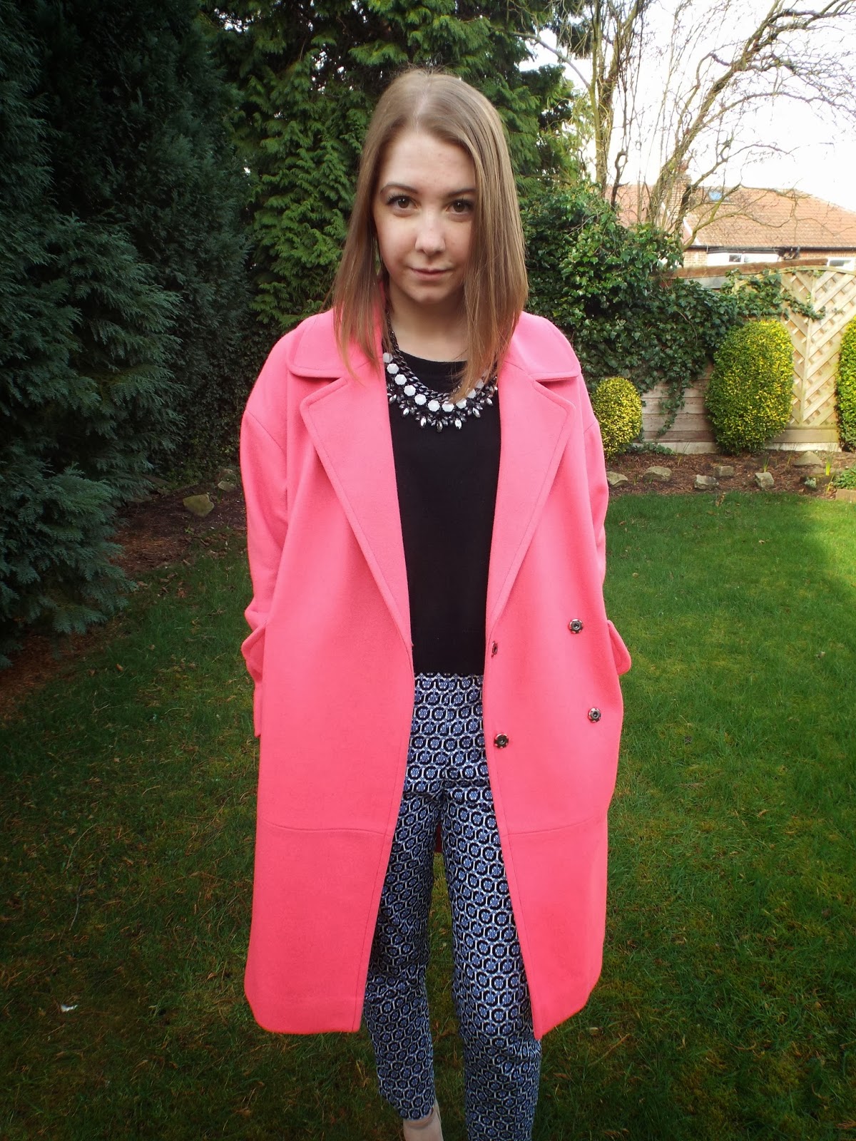 I love to clash colours when dressing and today it was the turn of cobalt blue and bright pink. Last year I practically lived in these cropped retro print trousers and I can’t wait to start wearing them again this spring. With such bold pink and blue tones, I thought a nude heel was the best way to finish the look. I wore these Asos heels to my 21st birthday and graduation last year and oh me oh my are they painful! It’s safe to say my feet were in tatters afterwards but “no pain, no gain” I suppose and the perspex heel is definitely a gain! Also, I’m very aware that I am constantly wearing this Zara necklace but it just seems to go with everything….bit clingy.