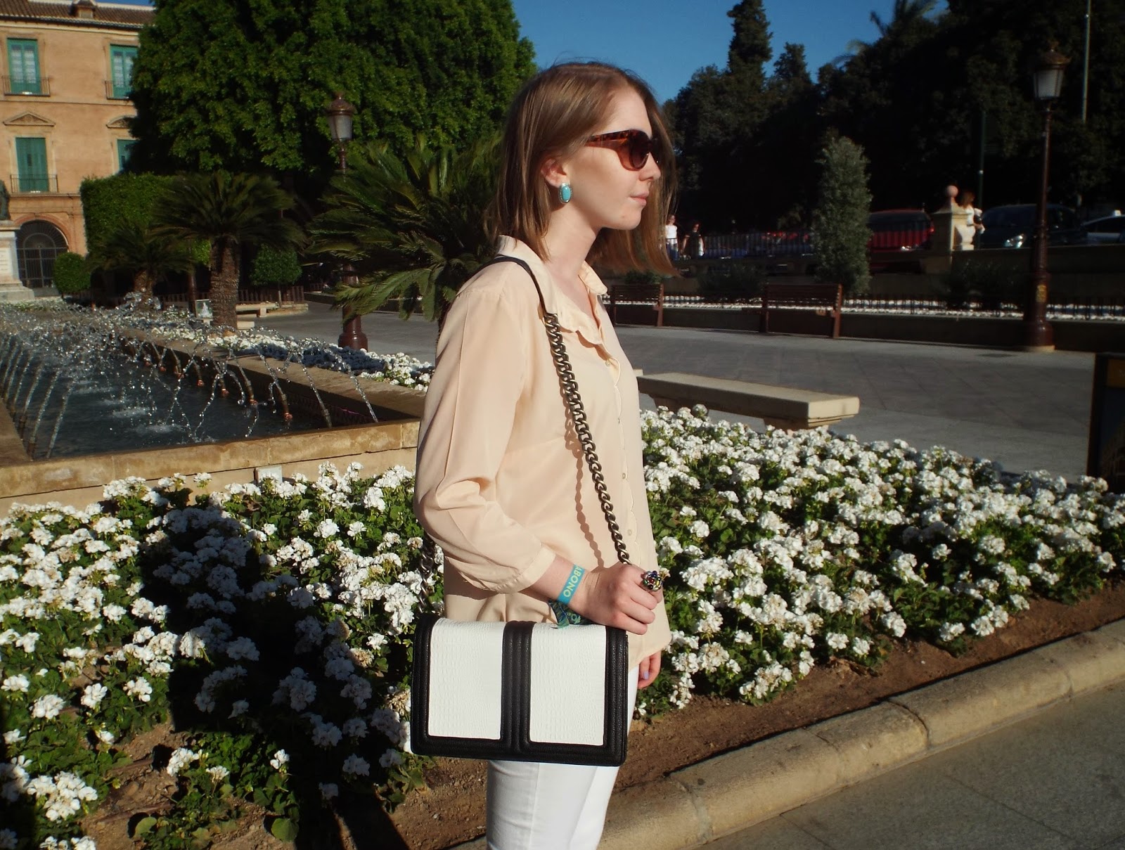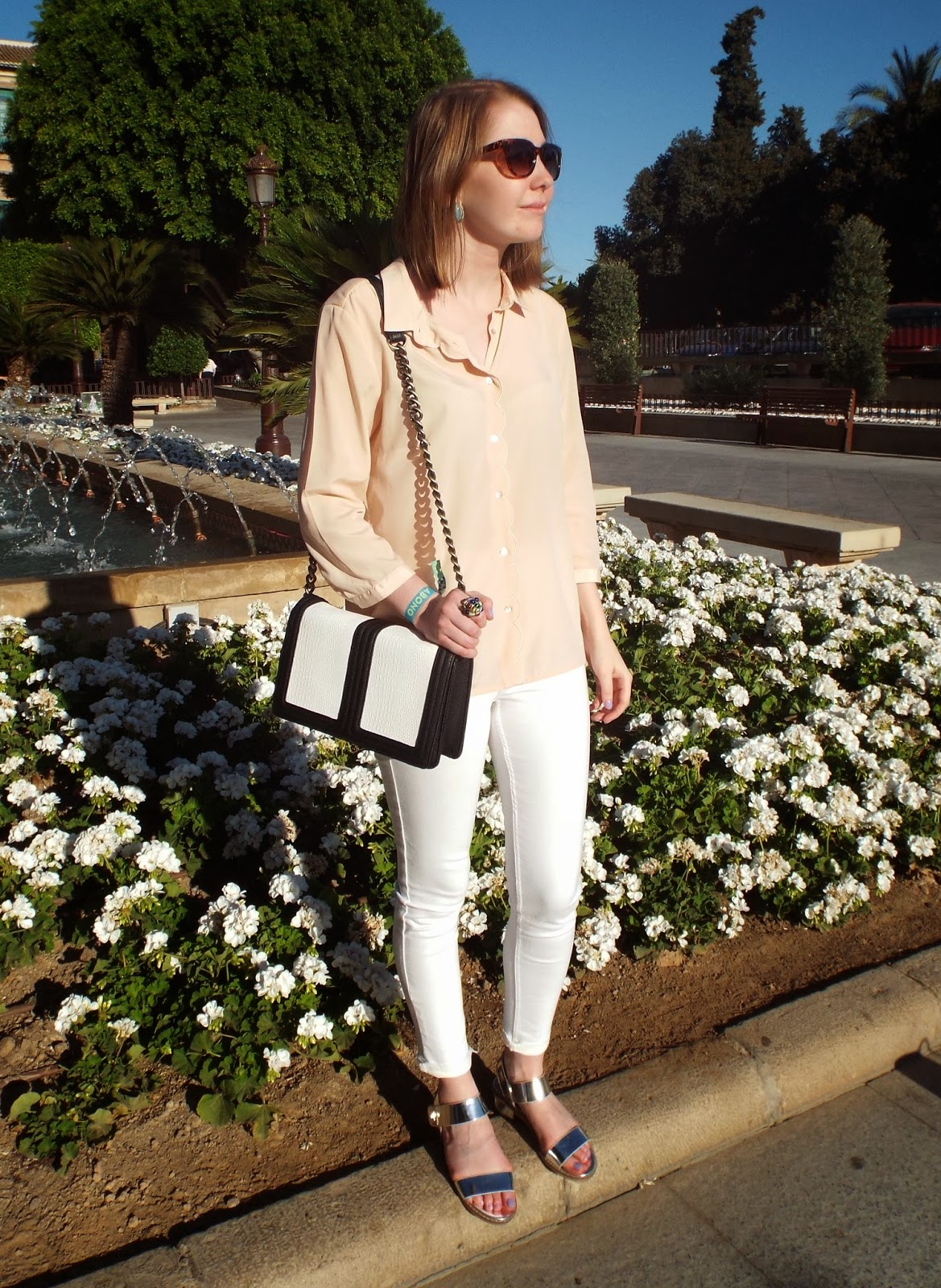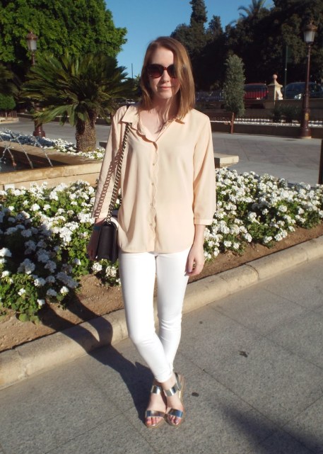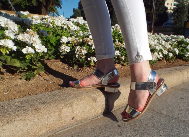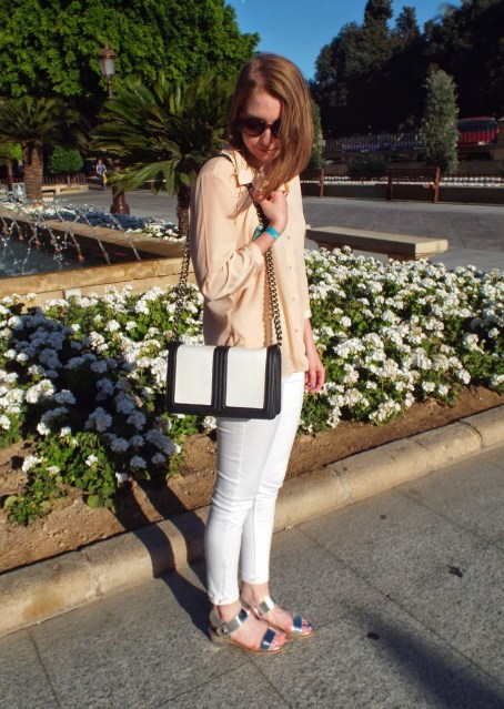 This past week I’ve been sunning it up in Murcia, Spain (and when I say sunning, I mean slapping on the factor 50 like there’s no tomorrow) and at long last was able to summer-friendly clothes. I’ve been after a pair white jeans to brighten up my wardrobe and quickly ordered these Topshop Jamie jeans when there was a 20% off offer a couple of weeks ago. At first I didn’t realise that the cuffs were ripped until they arrived so I was tempted to return them, but I’ve grown to love them and think the disheveled detailing gives them a unique edge! I also snapped up these metallic “Heartbreaker” sandals as I seem to have a little crush on all things silver recently, which are the perfect heel height for shorties like me who want a little extra height for the daytime.
