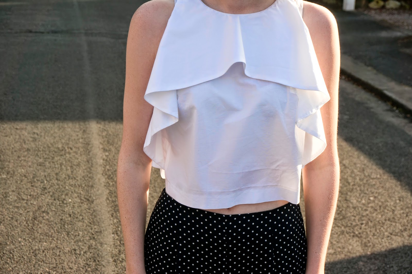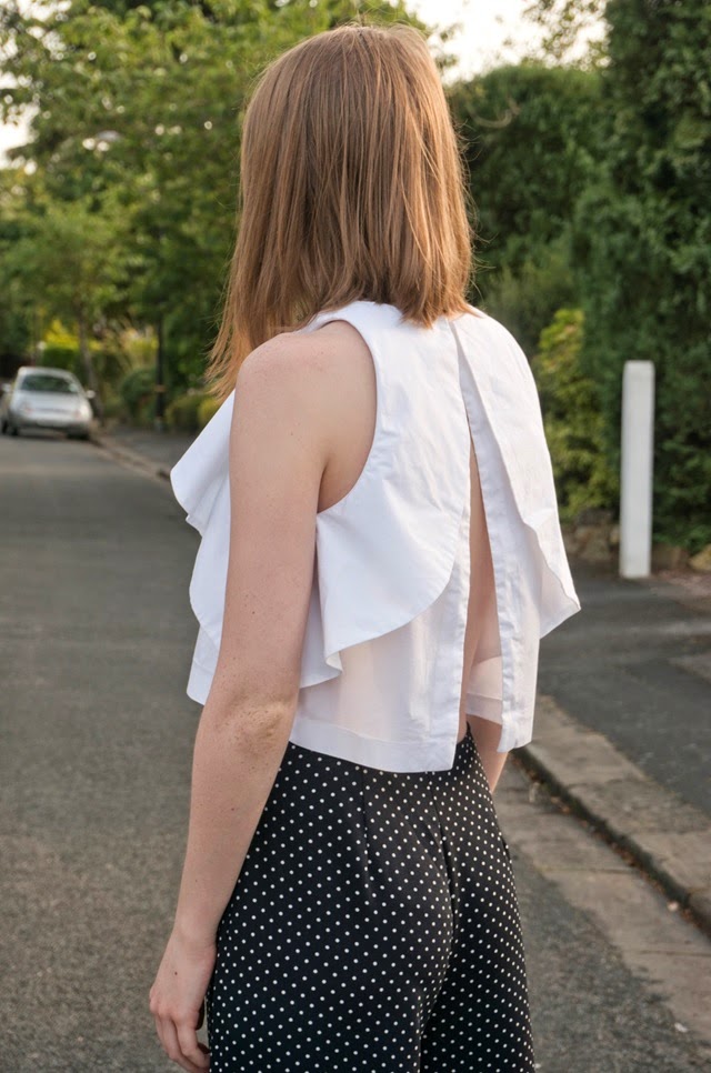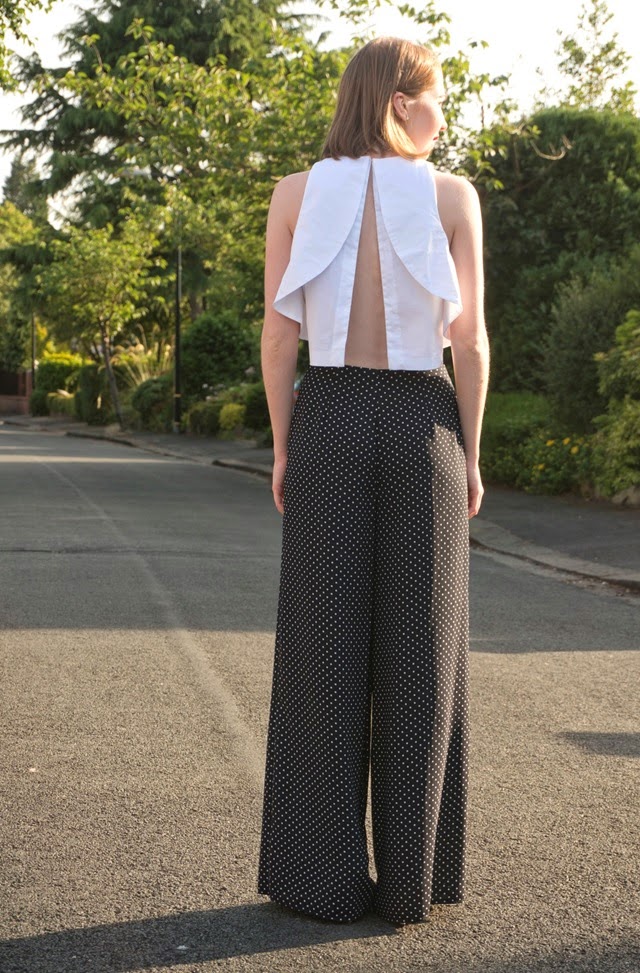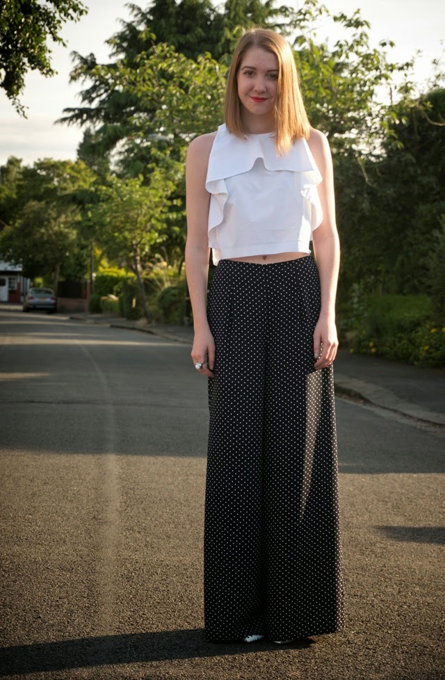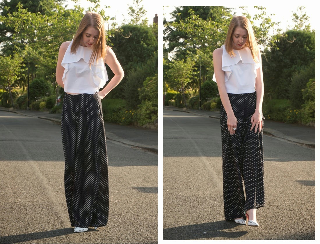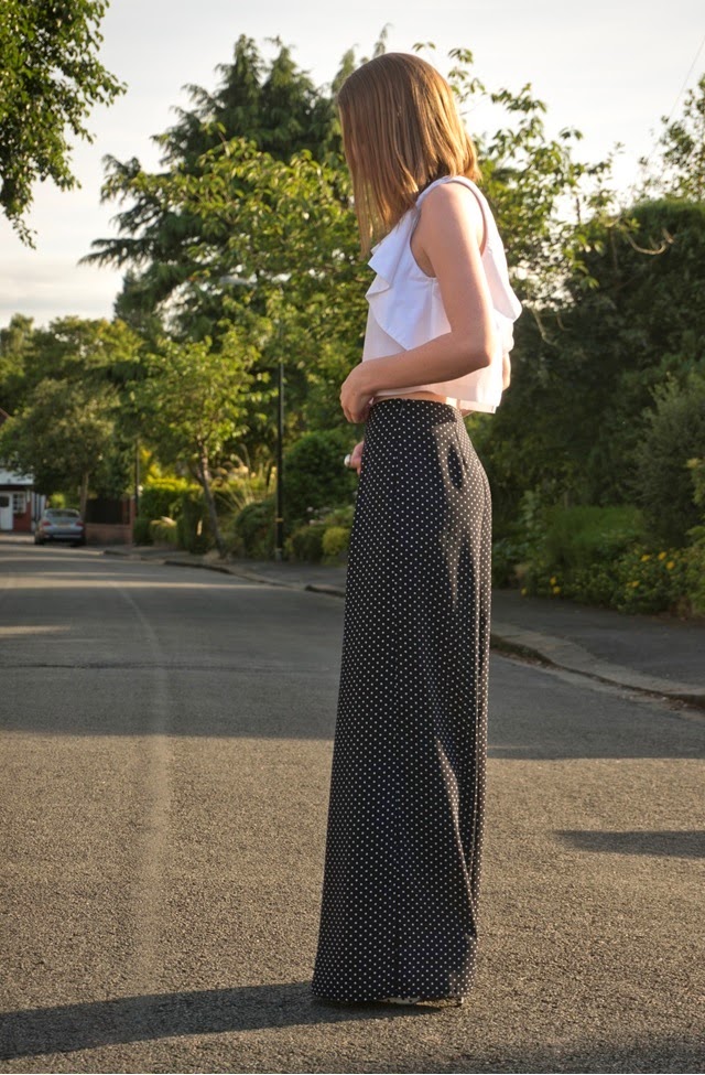 This take on polka-dot palazzos is a dressier look, spruced up with an back-exposing ruffle detailed crop-top and heels. I wasn’t 100% sure about rocking a polka-dot x2 outfit, but hey ho, looking back I quite like the reversed white with navy spot pattern of the shoes poking through a little. Recently I’ve been wearing a lot of navy and white and I mentioned in a earlier post that I’m forever wearing monochrome, but in my eyes navy with white  is a kind of nautical-monochrome…nautical-monochrome pyjama-chic anyone?!