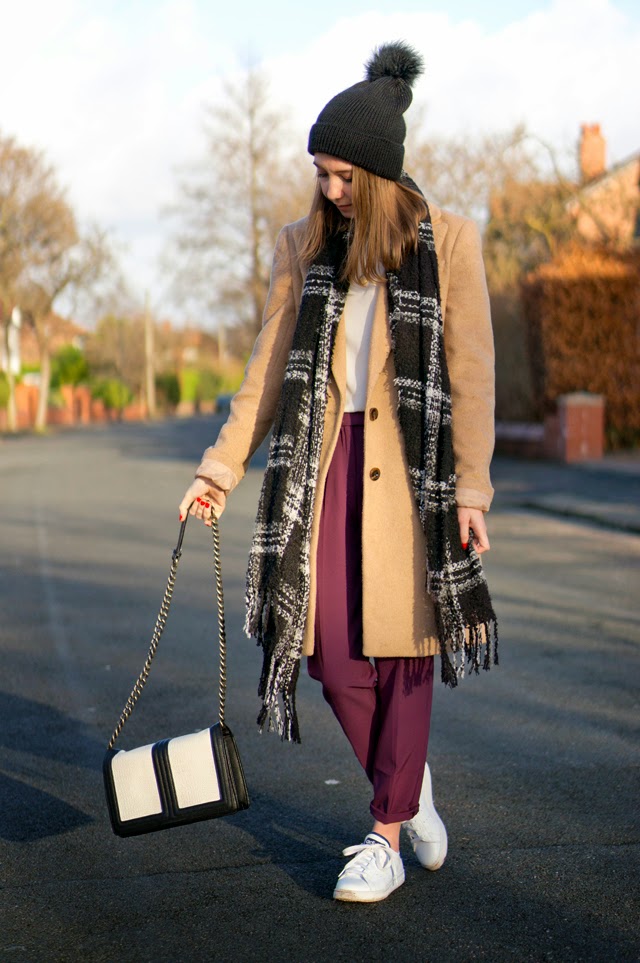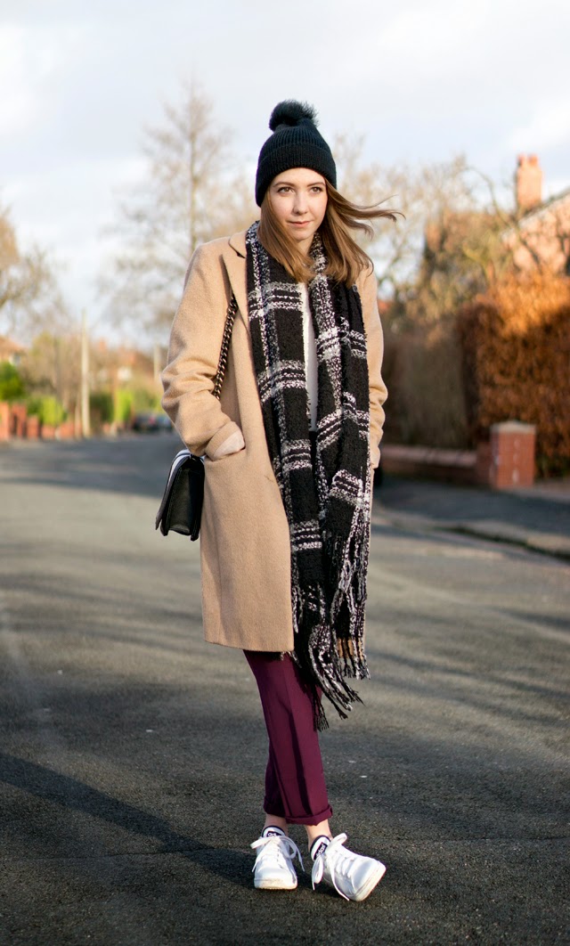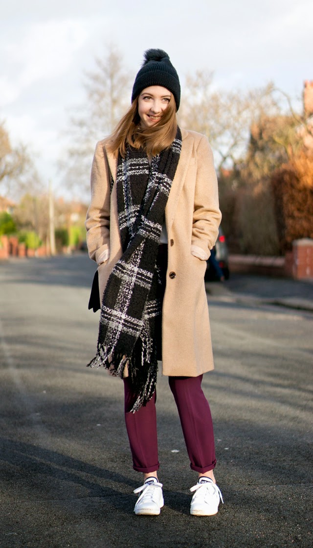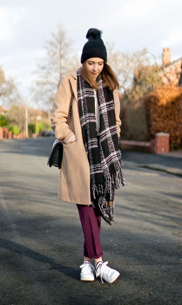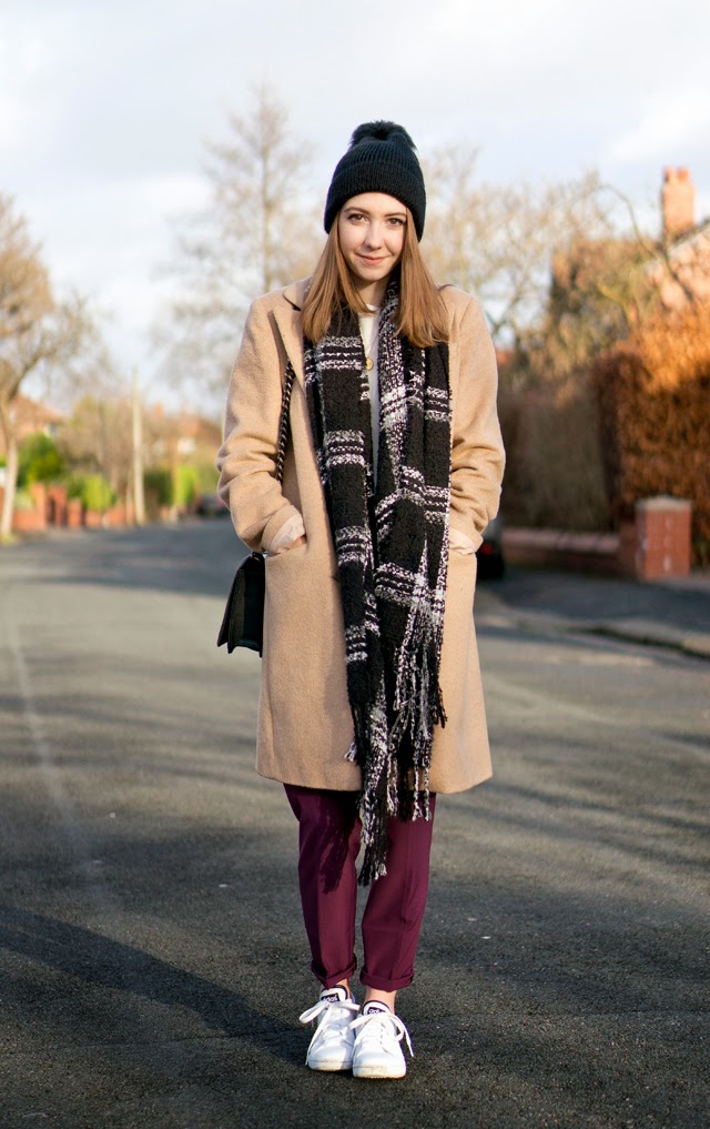 Hat: River Island via Asos/ Shoes: Adidas Stan Smiths/ Coat: Florence and Fred/ Trousers: Topshop/ Top: Matalan/ Bag: H&M/ Scarf: Primark