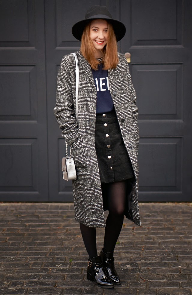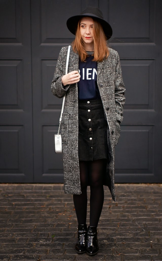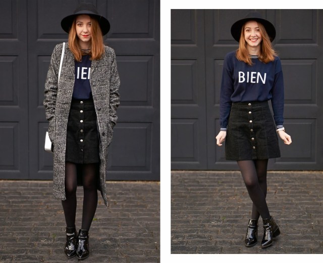 Since the Alexa Chung for AG Jeans collaboration exploded onto the scene, button down A-line skirts have been top of my wishlist. This black cord version was a piece sent straight from the 1970s gods (who I imagine wear flares and wet look coats), as it was an absolute steal in the Urban Outfitters sale! I’ve (not so) shamelessly paired it with a French slogan navy jumper here, a la Queen Chung herself.
