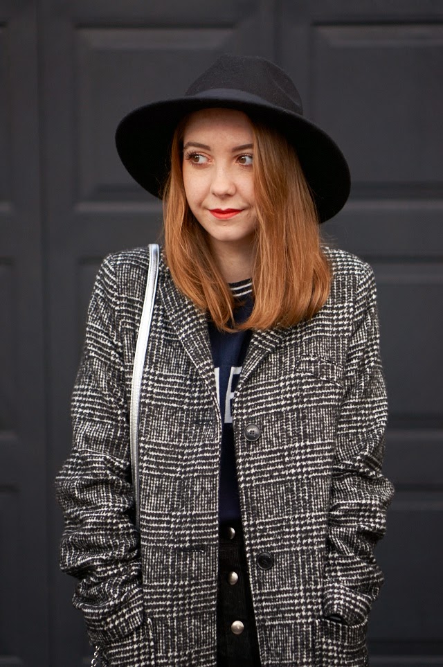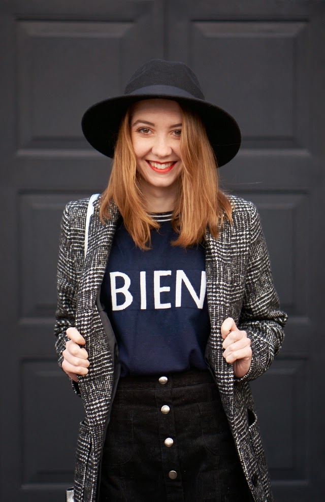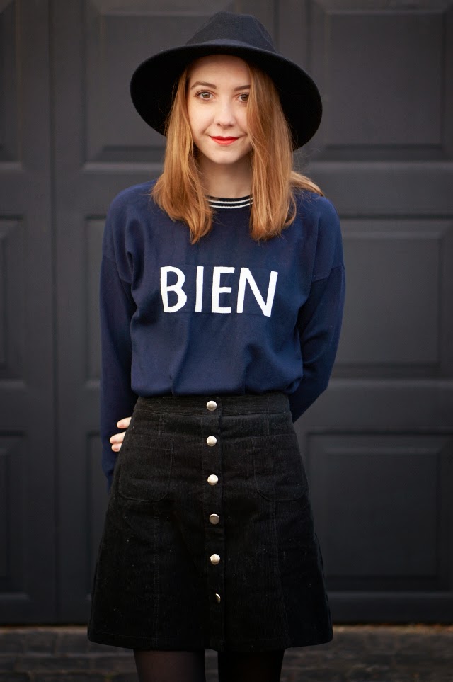 Since the Alexa Chung for AG Jeans collaboration exploded onto the scene, button down A-line skirts have been top of my wishlist. This black cord version was a piece sent straight from the 1970s gods (who I imagine wear flares and wet look coats), as it was an absolute steal in the Urban Outfitters sale! I’ve (not so) shamelessly paired it with a French slogan navy jumper here, a la Queen Chung herself.