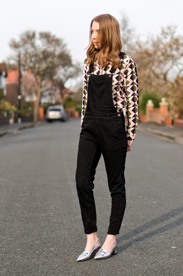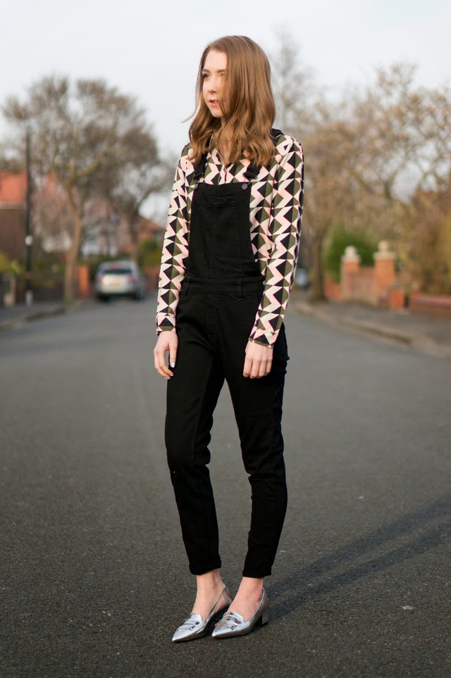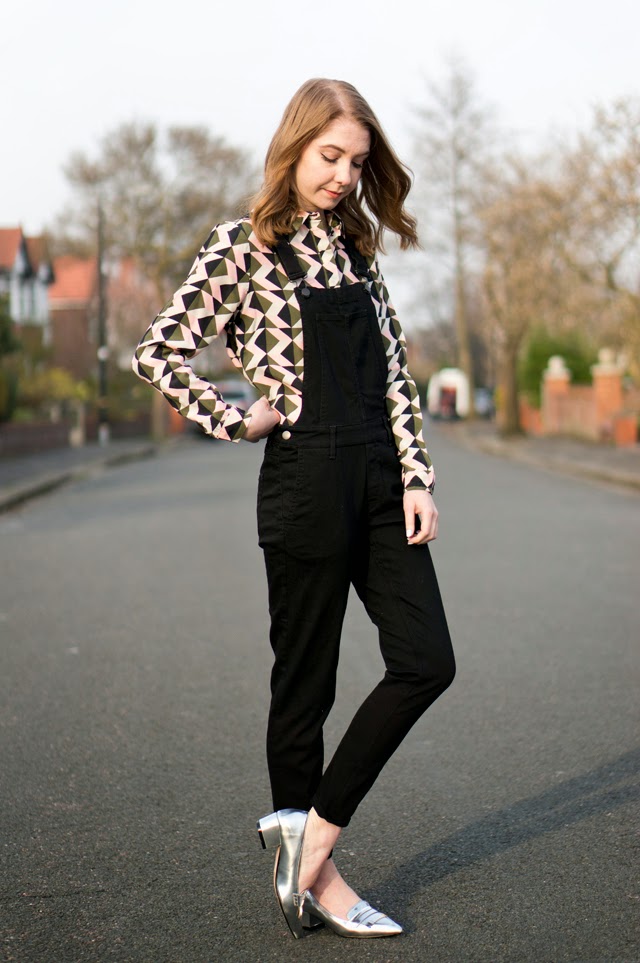 As I mentioned in my last post, I’m currently experimenting with this pair of H&M dungarees. My last look was quite casual and dressed down, so I’ve gone for something a little dressier this time with the silver shoes and geometric shirt. I might actually brave wearing this outfit to work this week even though I’ll definitely get a few “say whaaaat?!” looks headed my way. This is exactly the kind of outfit I’ll be wearing the next month or so in the awkward transition period. Just enough layering from the dungaree and shirt combo, but then a cheeky little spring appropriate ankle flash! Crazy, I know.