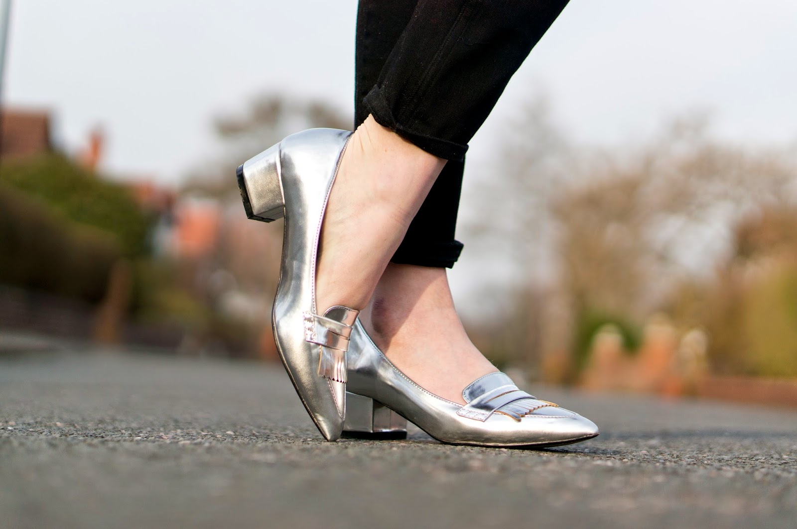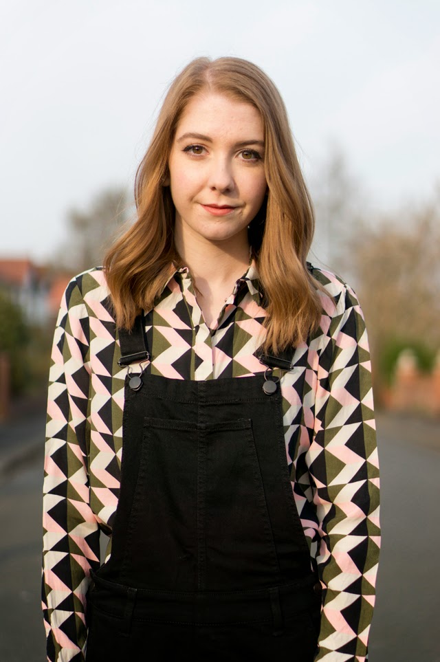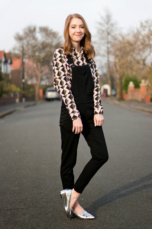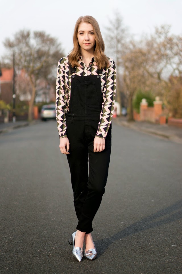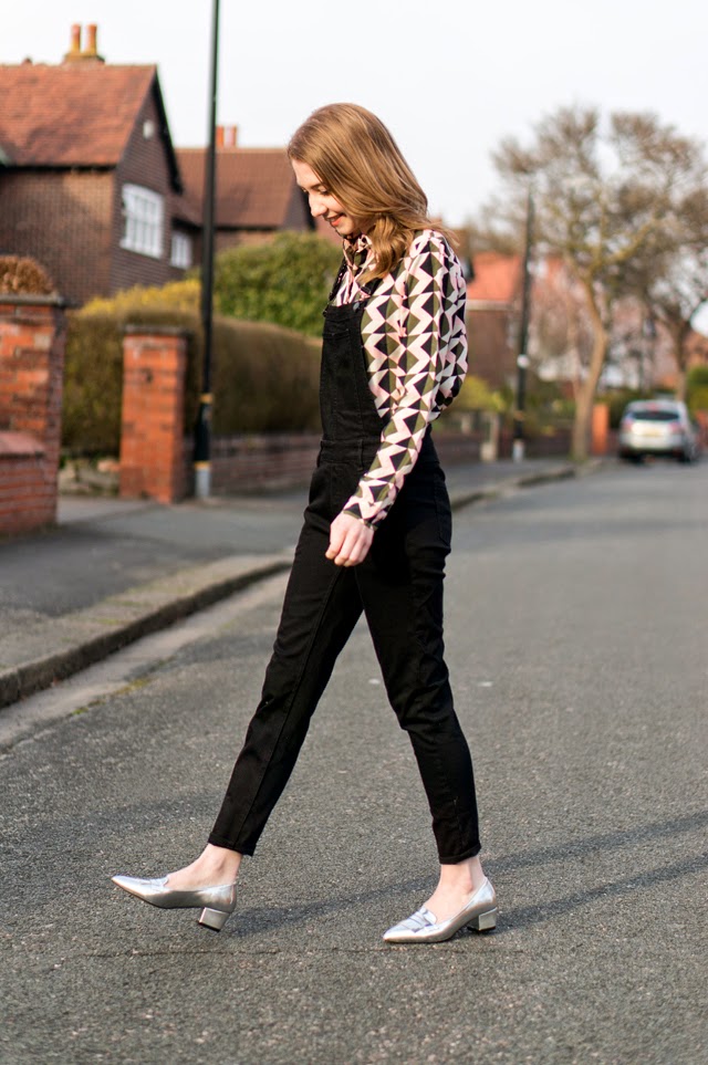 As I mentioned in my last post, I’m currently experimenting with this pair of H&M dungarees. My last look was quite casual and dressed down, so I’ve gone for something a little dressier this time with the silver shoes and geometric shirt. I might actually brave wearing this outfit to work this week even though I’ll definitely get a few “say whaaaat?!” looks headed my way. This is exactly the kind of outfit I’ll be wearing the next month or so in the awkward transition period. Just enough layering from the dungaree and shirt combo, but then a cheeky little spring appropriate ankle flash! Crazy, I know.