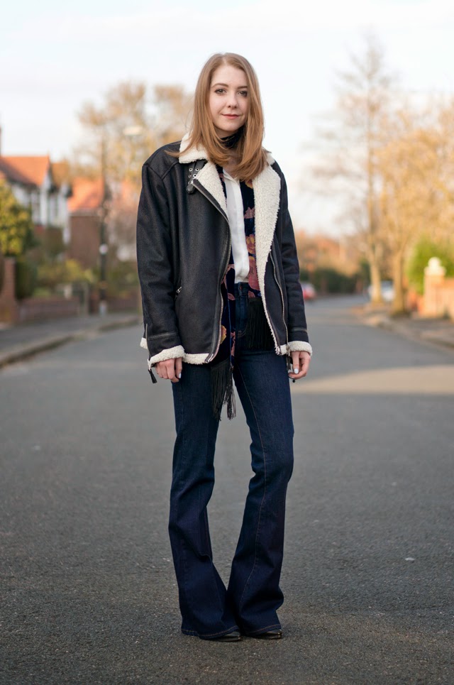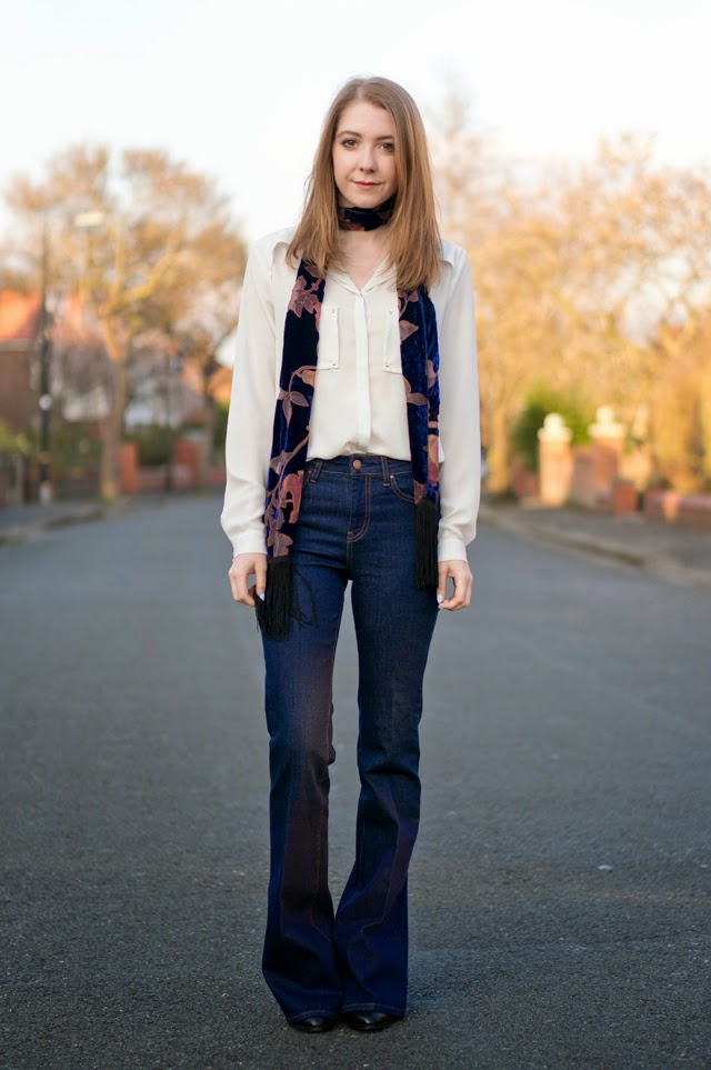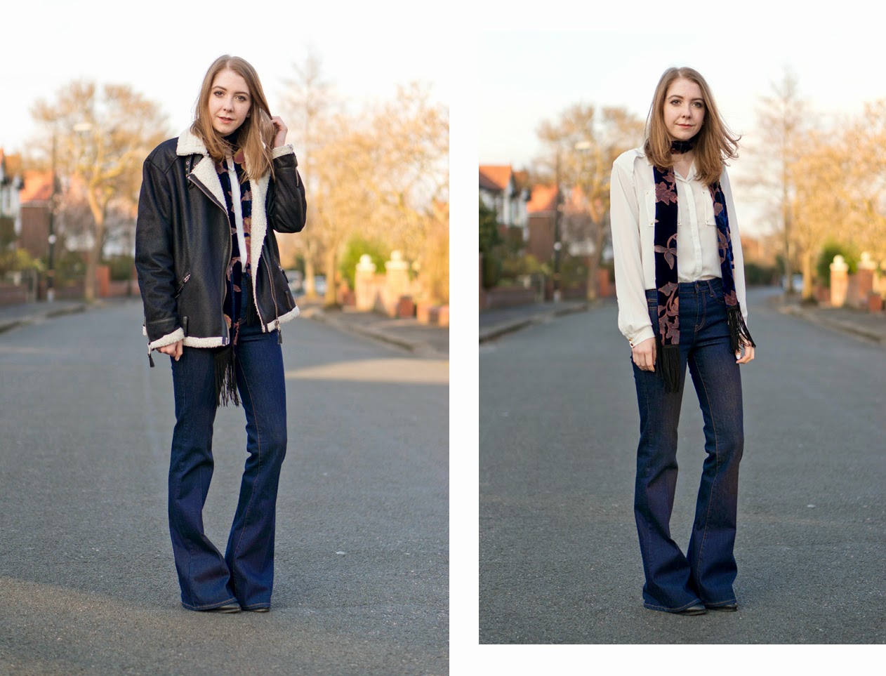 So here it is, the second way I’ve styled up these Topshop flares. This outfit has a real retro feel because of the skinny scarf and Top Gun-esque vibe jacket, but I think the smart blouse and modern backpack balance everything out. I haven’t yet braved flares at work but if I did, this is definitely how I’d style them.